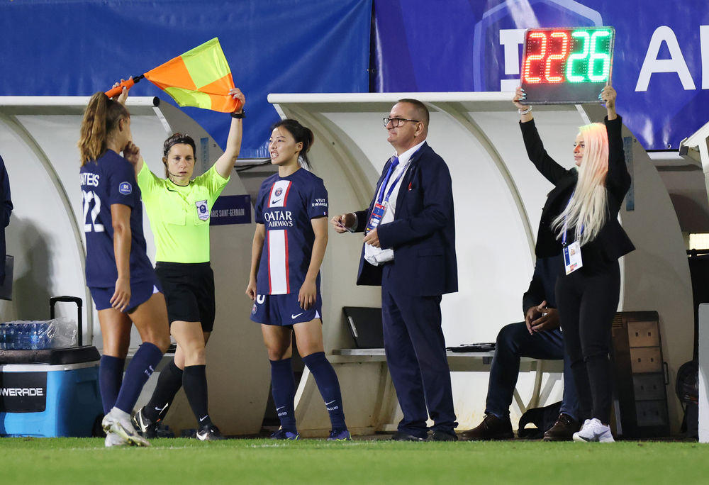 ↑2022年9月9日,租借加盟巴黎圣日耳曼女足的李夢雯(左三)在2022-2023賽季法國女子足球甲級聯賽第一輪比賽中準備替補上場。