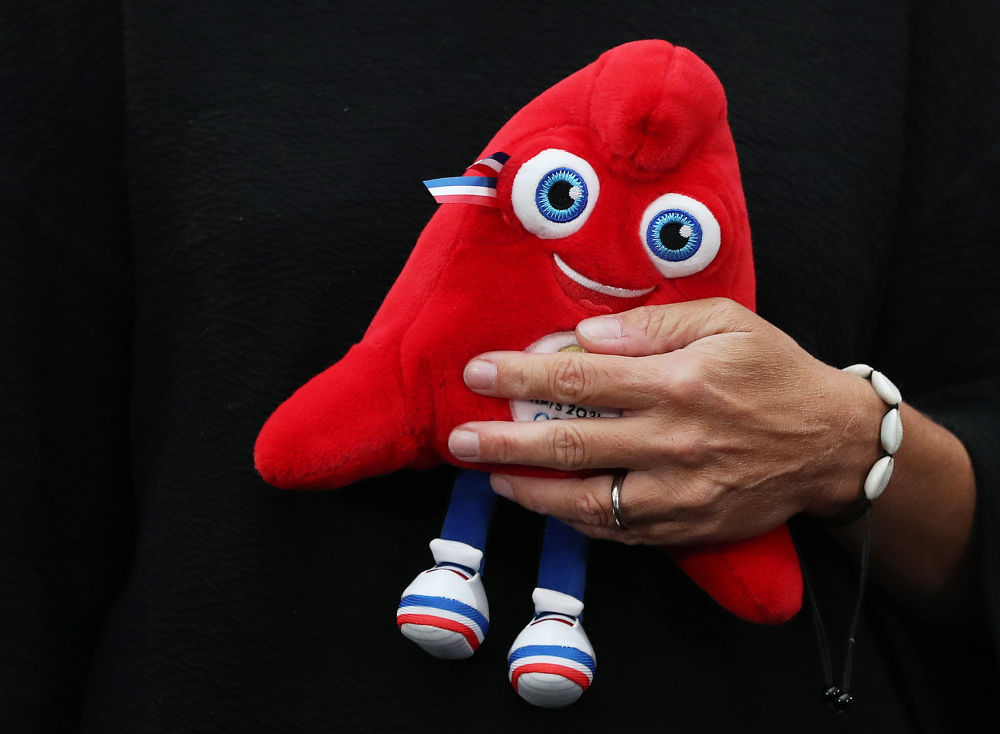 ↑2022年11月14日,一位嘉賓在發布會現場手持2024年巴黎奧運會吉祥物。當日,巴黎奧組委公布2024年奧運會和殘奧會的吉祥物“弗里熱(The Phryges)”,巴黎奧運會和殘奧會將使用同一吉祥物形象,但在細節設計上有稍許差別。