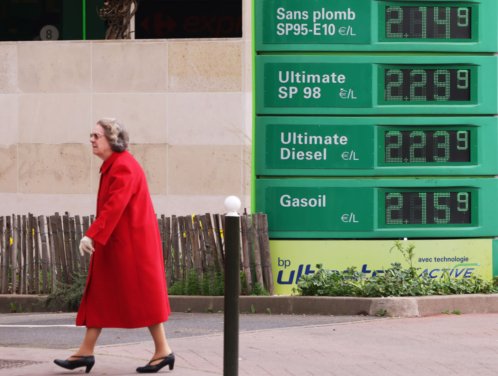 ↑2022年3月16日,一名老人走過法國巴黎一處加油站。
