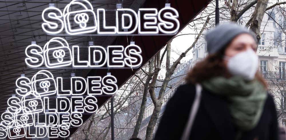 ↑2022年1月12日,一名女子走過法國巴黎街頭的打折季廣告。
