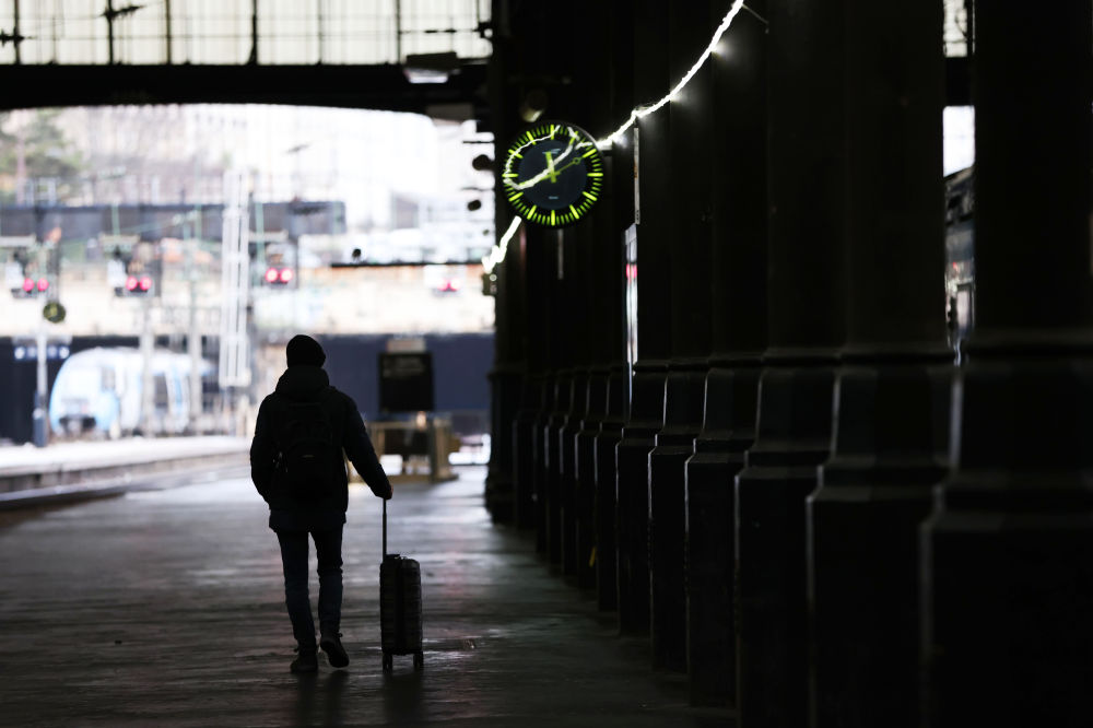 ↑2022年12月23日,一名旅客走過法國巴黎圣拉扎爾火車站的月臺。盡管法國國營鐵路公司23日宣布與工會達成協議,取消原計劃于新年舉行的大罷工,但22日就已經開始的罷工活動仍對圣誕假期的鐵路交通造成一定影響。