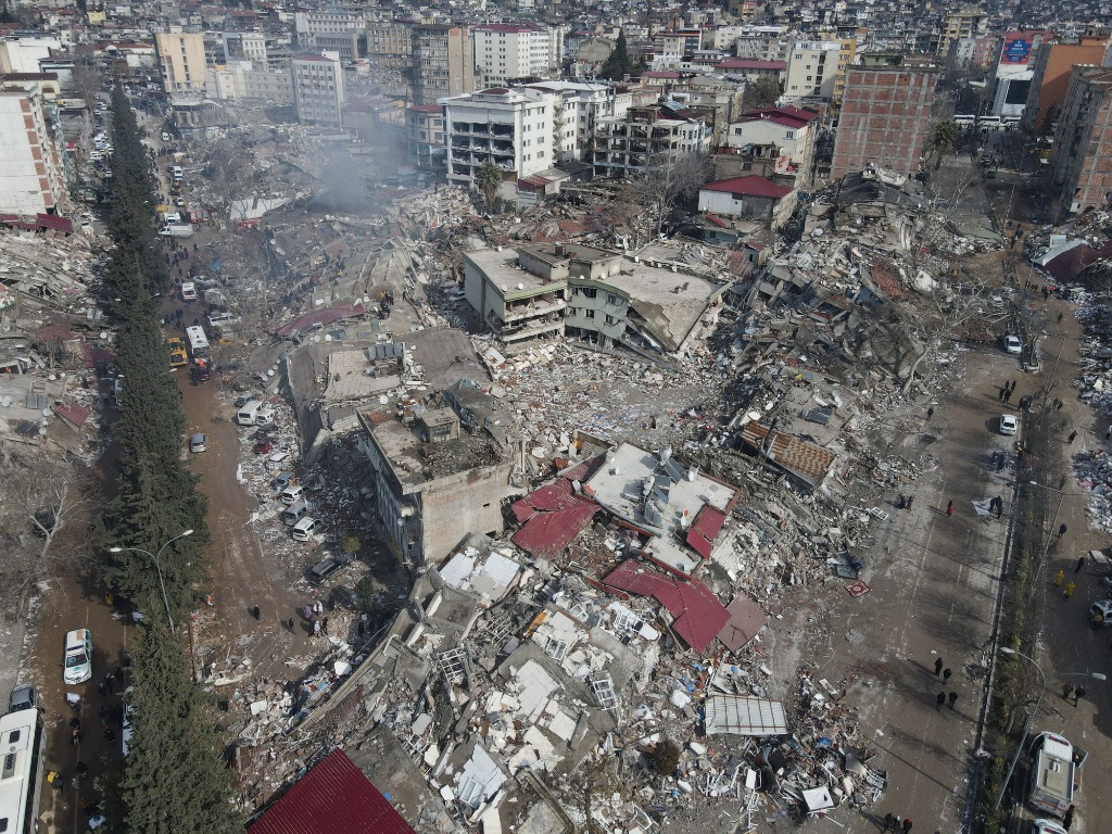 這是2月7日在土耳其南部卡赫拉曼馬拉什市市中心拍攝的震后景象(無人機照片)。新華社發(穆斯塔法·卡亞攝)