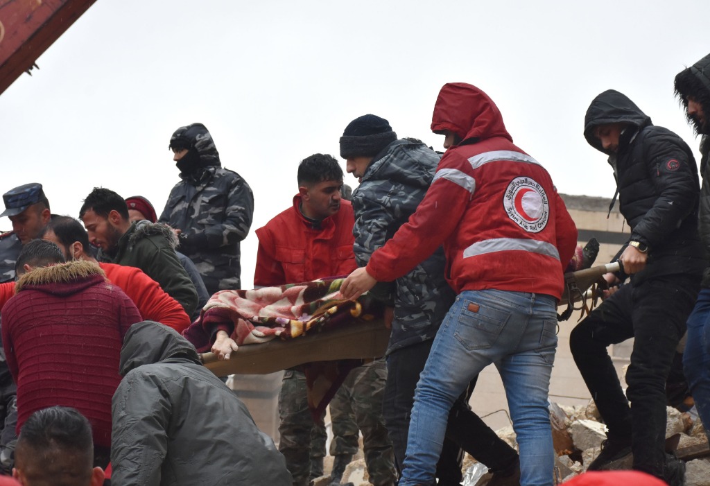 2月6日,人們在敘利亞哈馬省轉運傷者。新華社發