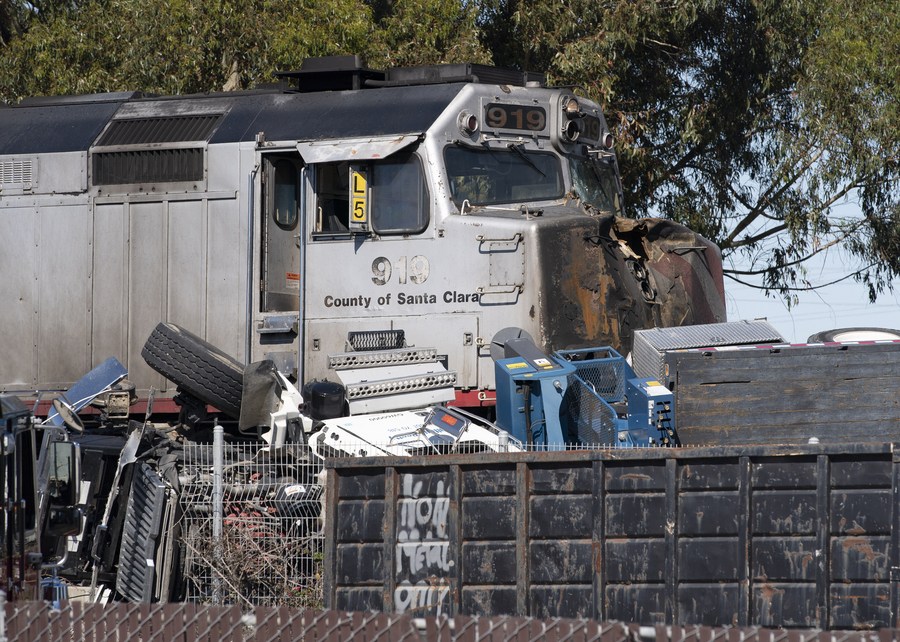 這是2022年3月10日在美國加利福尼亞州圣布魯諾拍攝的事故現(xiàn)場。美國加州圣布魯諾當(dāng)天發(fā)生通勤列車與工程車輛相撞事故,造成13人受傷。新華社發(fā)(李建國攝)