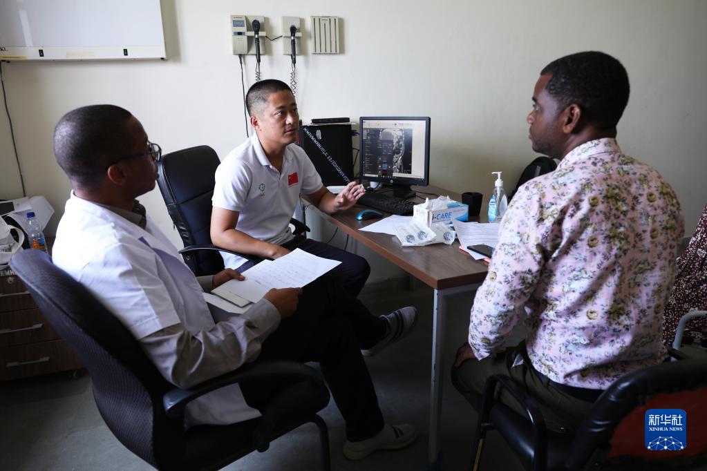 2月22日,在坦桑尼亞桑給巴爾島納茲莫加醫(yī)院,泌尿外科醫(yī)生郭偉(左二)給病人看病。