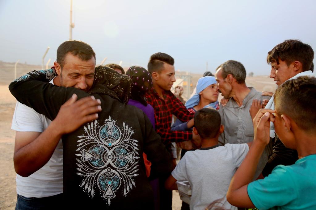 2017年5月30日,在伊拉克摩蘇爾東部約30公里處的哈桑沙姆U2安置營地,剛從交戰(zhàn)區(qū)撤出的平民見到家人相擁而泣。新華社發(fā)(哈利勒·達(dá)伍德攝)