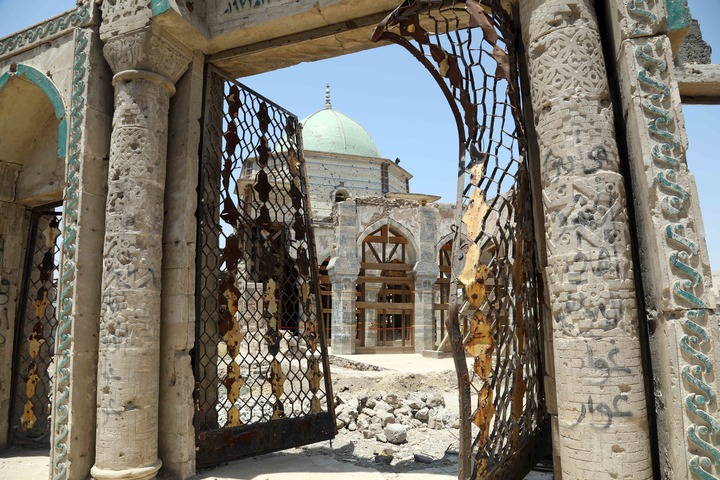 這是2022年7月3日在伊拉克摩蘇爾老城拍攝的努里清真寺大門。新華社發(fā)(哈利勒·達(dá)伍德攝)