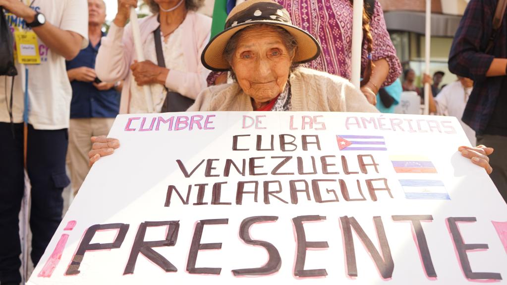2022年6月10日,在美國加利福尼亞州洛杉磯,一名抗議者手持標語牌參加游行,抗議美國拒絕古巴、尼加拉瓜、委內瑞拉三國領導人參加美洲峰會。新華社發