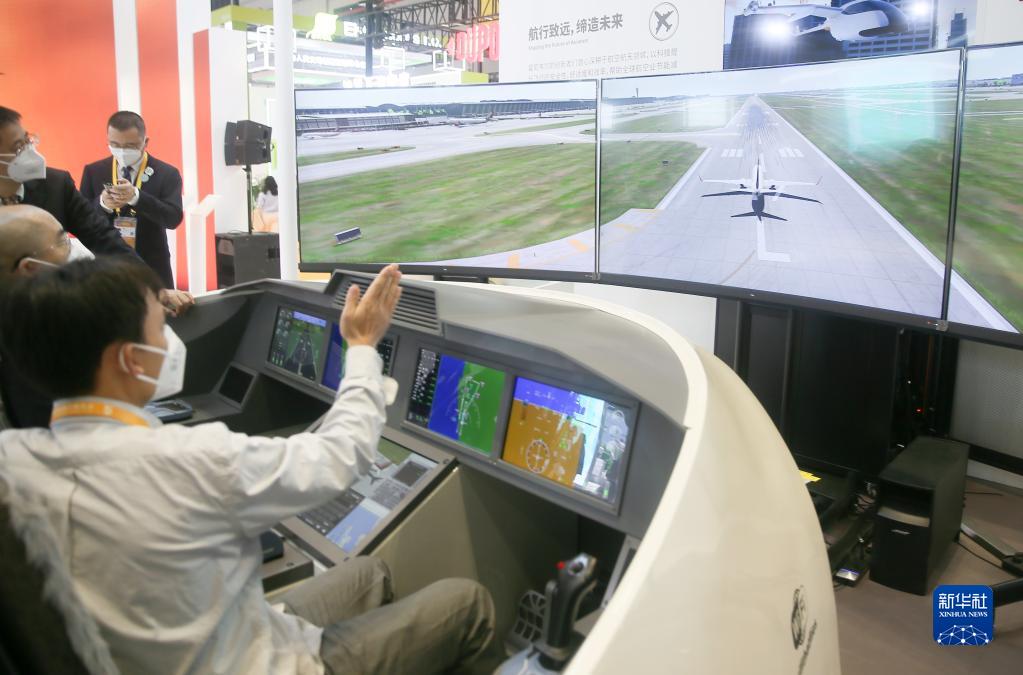 在第五屆進博會技術(shù)裝備展區(qū)霍尼韋爾展臺,參觀者在工作人員指導(dǎo)下體驗?zāi)M飛行(2022年11月5日攝)。新華社記者 張可任 攝