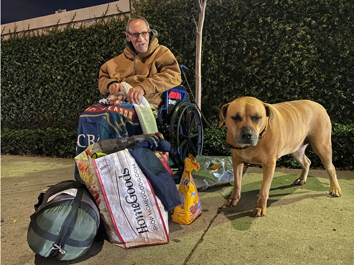 2023年1月13日洛杉磯縣海港城區域,無家可歸者、72歲的邁克坐在街邊一輛輪椅上,旁邊是他收養的黃狗。新華社發(曾慧攝)