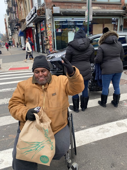 2023年1月14日,美國紐約市曼哈頓下城包厘街,退伍老兵普林斯·法克斯在收到志愿者發放的免費食物后高興地舉起手。新華社記者劉亞南攝