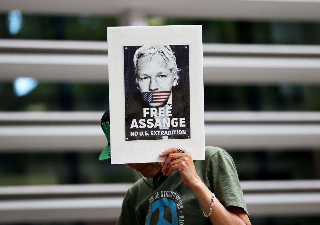 2022年5月17日,一名示威者在倫敦英國內(nèi)政部大樓門前手舉“釋放阿桑奇”標(biāo)語。新華社記者李穎攝