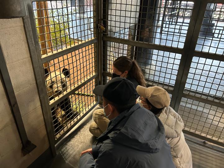 北京動(dòng)物園工作人員和孟菲斯動(dòng)物園工作人員一起同“丫丫”增進(jìn)熟悉度(4月11日攝)