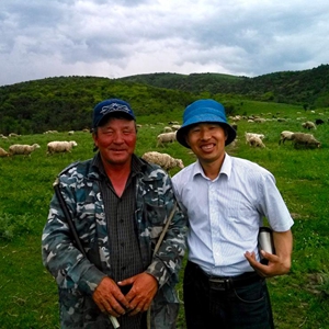2017年,陜西省考古研究院赴哈薩克斯坦考古隊現場負責人丁巖與哈薩克斯坦牧羊人合影。(受訪者供圖)