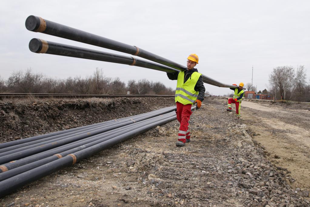 2月22日,工作人員在匈牙利索包德薩拉什的匈塞鐵路匈牙利段工地搬運(yùn)電纜保護(hù)管。新華社記者鄭煥松攝