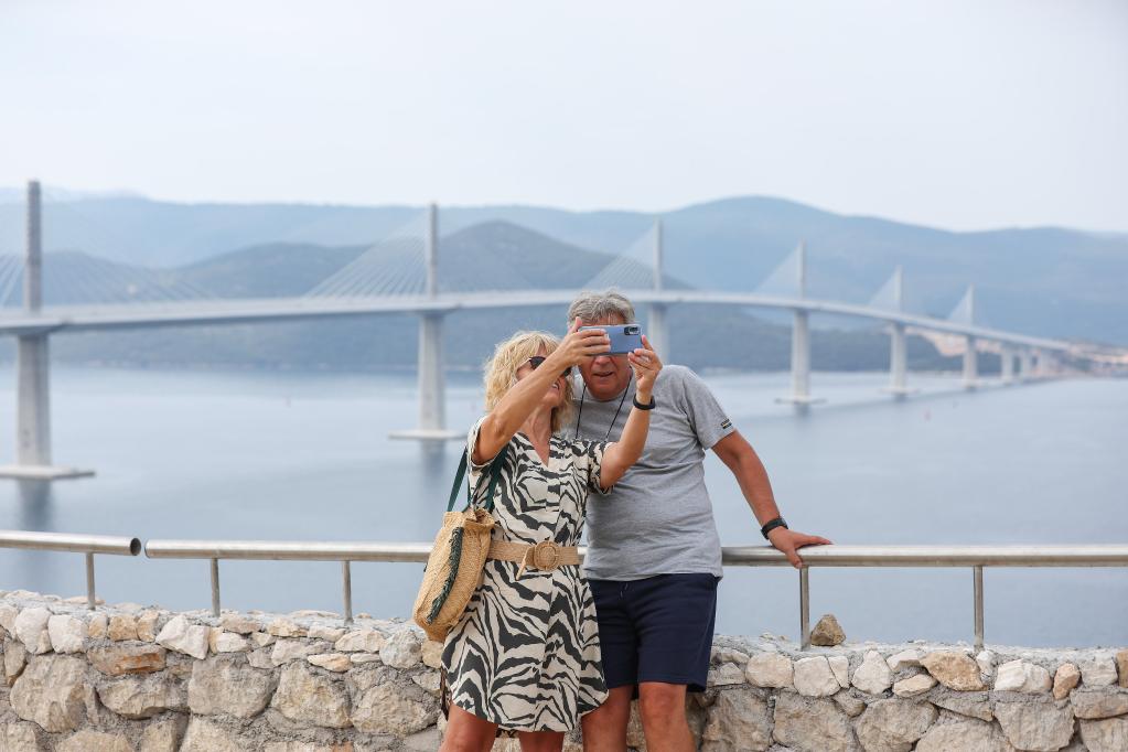 2022年7月27日,民眾在克羅地亞科馬爾納與新通車的佩列沙茨大橋合影。新華社發(fā)(Pixsell圖片社,伊戈?duì)枴た死麛z)