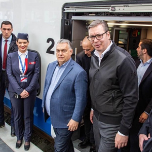 2022年3月19日,匈塞鐵路塞爾維亞境內(nèi)貝諾段開通運(yùn)營。塞爾維亞總統(tǒng)武契奇(中右)和匈牙利總理歐爾班(中左)乘坐列車抵達(dá)諾維薩德火車站。新華社發(fā)(王韡攝)