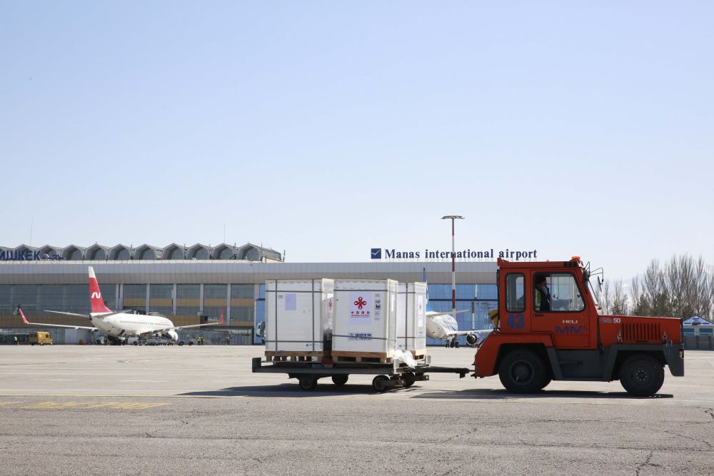 在吉爾吉斯斯坦比什凱克瑪納斯國(guó)際機(jī)場(chǎng),工人轉(zhuǎn)運(yùn)新冠疫苗(2021年3月19日攝)。新華社發(fā)(羅曼攝)