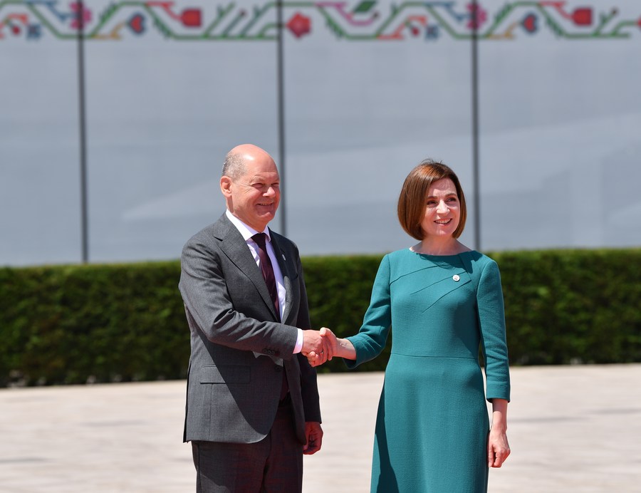 6月1日,在摩爾多瓦布爾博阿克,摩爾多瓦總統(tǒng)桑杜(右)歡迎前來參加第二屆歐洲政治共同體領(lǐng)導(dǎo)人會(huì)議的德國總理朔爾茨。新華社記者連漪攝