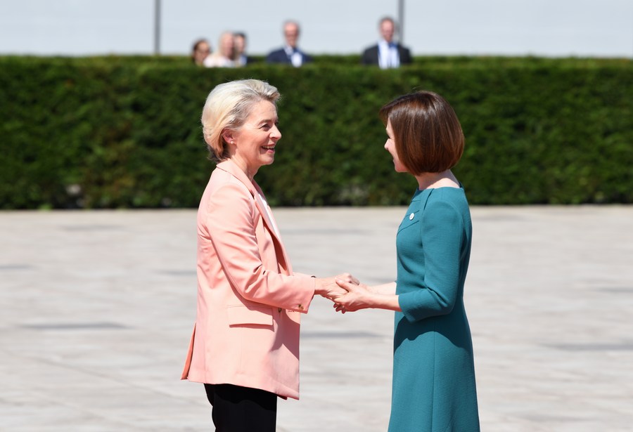 6月1日,在摩爾多瓦布爾博阿克,摩爾多瓦總統(tǒng)桑杜(右)歡迎前來參加第二屆歐洲政治共同體領(lǐng)導(dǎo)人會(huì)議的歐盟委員會(huì)主席馮德萊恩。新華社記者連漪攝
