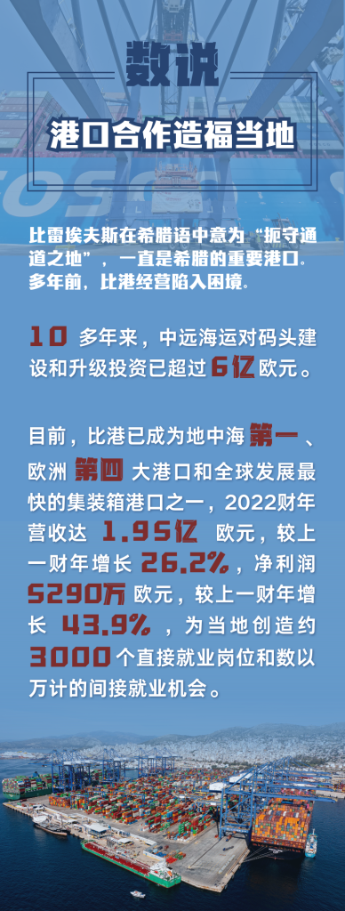比雷埃夫斯在希臘語中意為“扼守通道之地”,一直是希臘的重要港口。多年前,比港經營陷入困境。中國遠洋海運集團(中遠海運)2008年與希臘方面簽署特許經營權協議,2010年接管比港二號、三號集裝箱碼頭,2016年收購比港港務局67%股權并接手港務局經營。十多年來,中遠海運對碼頭建設和升級投資已超過6億歐元。如今比港已成為地中海第一、歐洲第四大港口和全球發展最快的集裝箱港口之一,2022財年營收達1.95億歐元,較上一財年增長26.2%,凈利潤5290萬歐元,較上一財年增長43.9%,為當地創造約3000個直接就業崗位和數以萬計的間接就業機會。