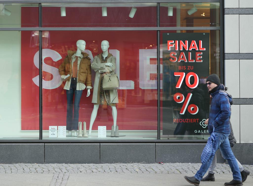 3月2日,在德國柏林,行人經(jīng)過一家打折店鋪。(新華社發(fā),斯特凡·蔡茨攝)