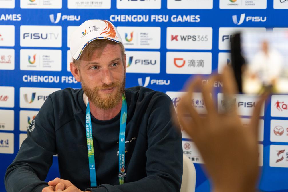 這是8月6日拍攝的萊茵-魯爾2025世界大學(xué)生夏季運動會首席新聞宣傳官馬庫斯·柯尼希在接受媒體采訪。 新華社記者 龍泠宇 攝