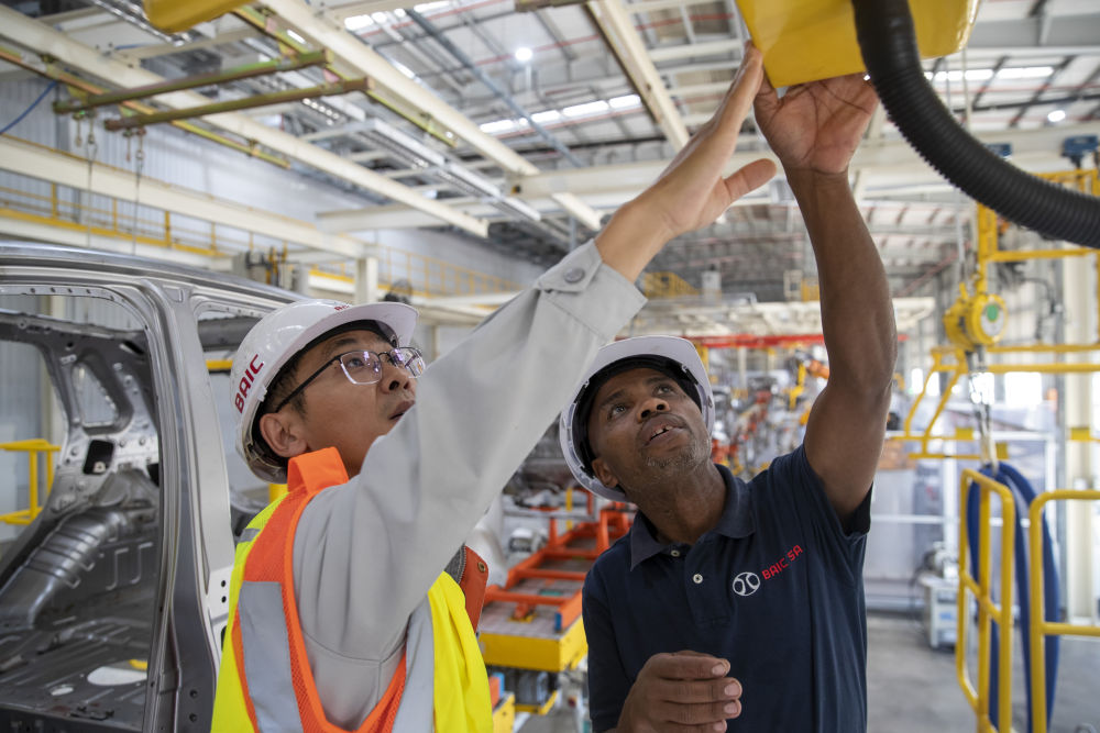 在南非東開普省北汽南非工廠,南非員工邦加尼(右)與中國同事方龍一起工作(2023年5月9日攝)。2022年,中國汽車品牌在南非的銷量突破3.5萬臺,2023年預計將突破4萬臺。