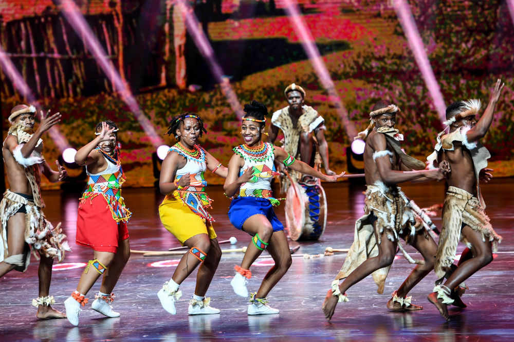 來自南非的演員在中國內蒙古呼和浩特市舉行的第十一屆中國國際民間藝術節上表演《祖魯歌舞》(2019年8月23日攝)。
