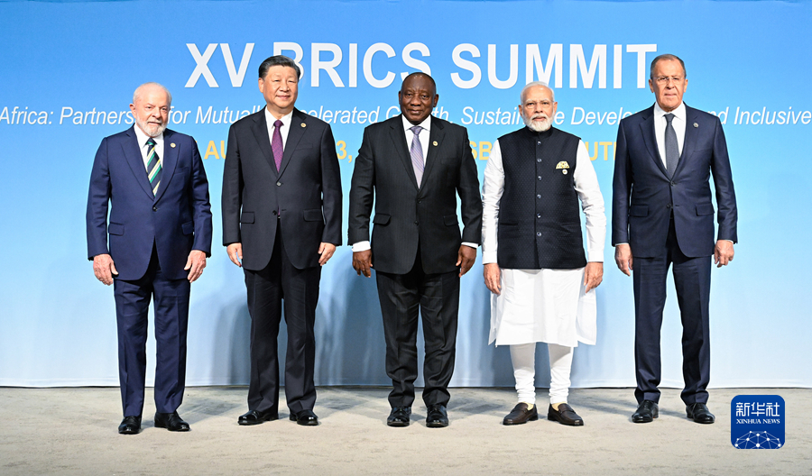 當地時間8月23日上午,金磚國家領導人第十五次會晤在約翰內斯堡杉藤會議中心舉行。南非總統拉馬福薩主持會晤。中國國家主席習近平、巴西總統盧拉、印度總理莫迪和俄羅斯總統普京(線上)出席。這是會晤期間,五國領導人集體合影。