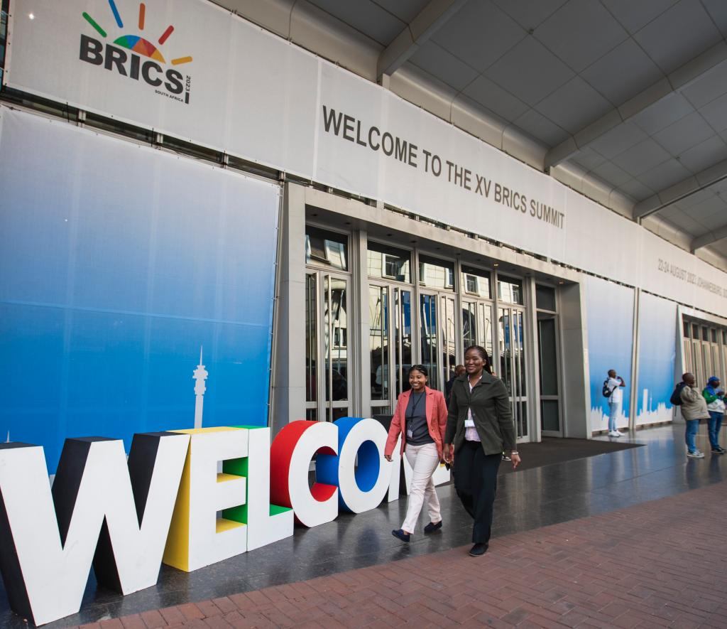在南非約翰內斯堡,行人走過金磚國家領導人第十五次會晤舉辦場所。