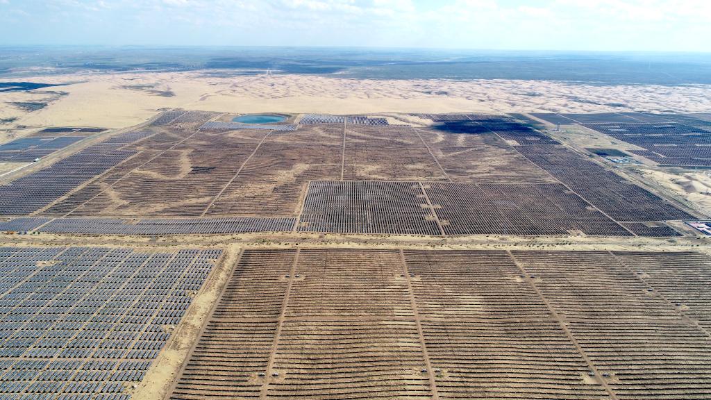 這是8月24日拍攝的鄂爾多斯市達(dá)拉特光伏基地(無人機照片)。新華社記者 賀書琛 攝