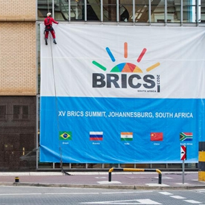 8月17日,在南非約翰內斯堡,工人在杉藤會議中心外布置金磚峰會橫幅。(新華社記者張譽東攝)