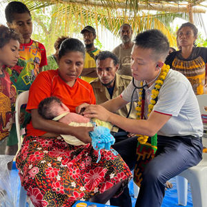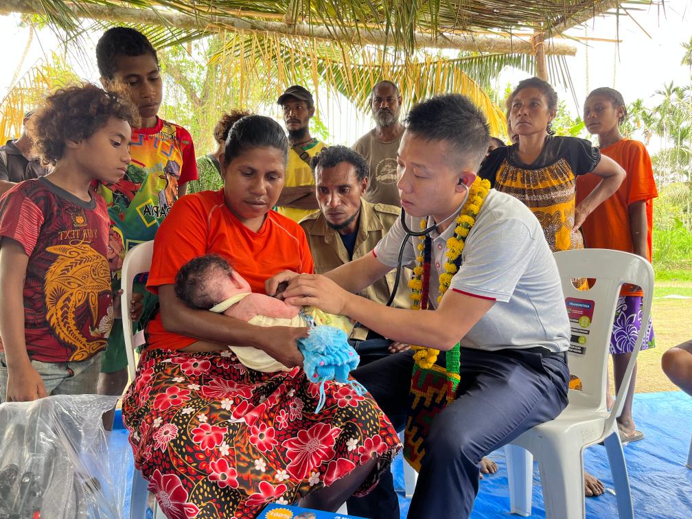 2023年8月5日,在巴布亞新幾內亞中央省的一個村莊里,第12批援巴新中國醫療隊副隊長、新生兒科副主任醫師劉振球為當地嬰兒聽診檢查。從2002年起,中國連續向巴新派出12批醫療隊,為提高巴新醫療衛生水平、促進中巴新友好作出積極貢獻。新華社發(第12批援巴新中國醫療隊供圖)