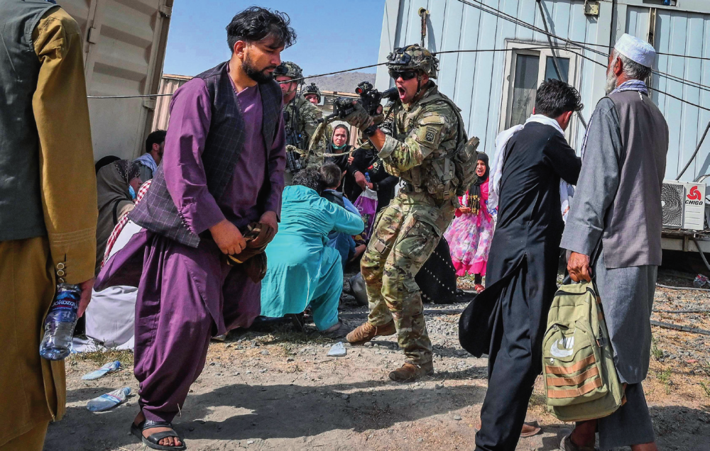 在阿富汗喀布爾機場,一名美軍士兵用槍指向一名阿富汗男子(2021年8月16日攝)新華社/法新
