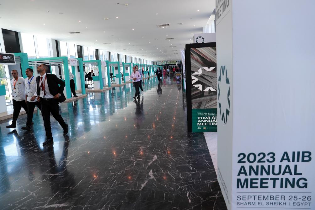 9月26日,在埃及沙姆沙伊赫,參會(huì)者走過亞投行第八屆理事會(huì)年會(huì)的展板。新華社記者隋先凱攝