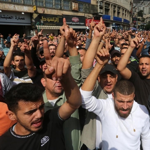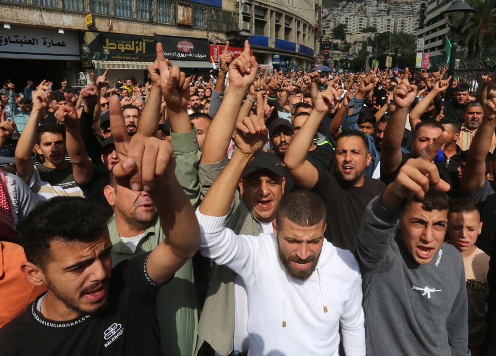 10月18日,在約旦河西岸城市納布盧斯,民眾上街游行抗議加沙醫(yī)院遭襲。新華社發(fā)(尼達(dá)爾·艾仕塔耶?dāng)z)