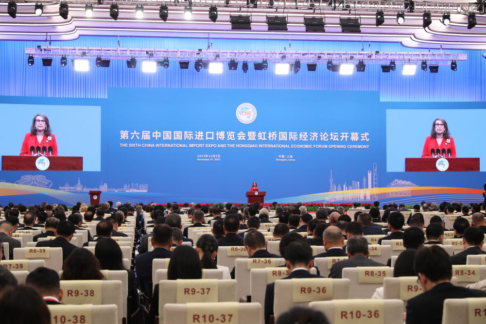 11月5日,聯合國貿易和發展會議秘書長格林斯潘在第六屆中國國際進口博覽會開幕式上致辭。新華社記者 方喆 攝