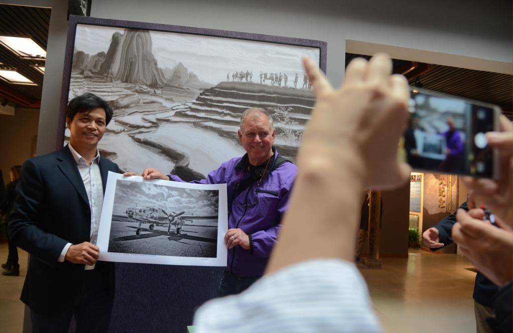 2018年10月25日,在衢州訪問的美國雷德溫市攝影家向紀念館捐贈他拍攝的杜立特突襲行動同型轟炸機照片。(王飛 攝)