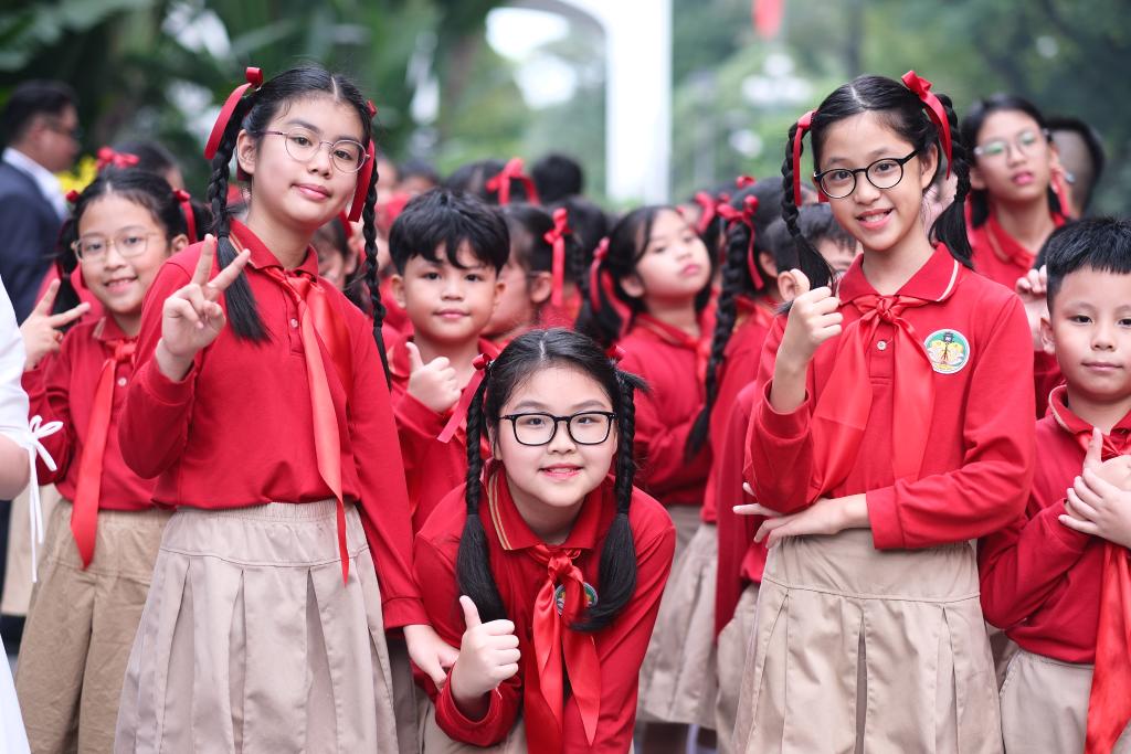 主席府廣場(chǎng)莊嚴(yán)熱烈,金星紅旗同五星紅旗相映成輝,數(shù)百名歡迎兒童綻放的笑容燦爛明媚。