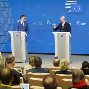 12月15日,在比利時布魯塞爾,歐洲理事會主席米歇爾在歐盟峰會期間主持召開新聞發布會。新華社記者 趙丁喆 攝