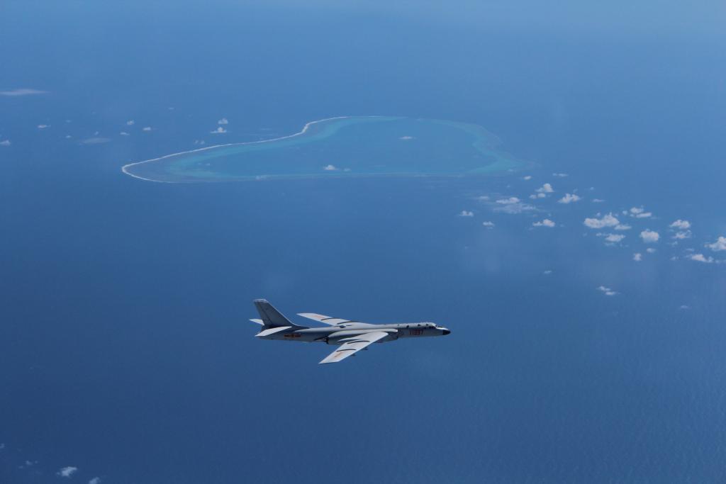 這是轟-6K戰機在黃巖島上空巡航(資料照片)。新華社發