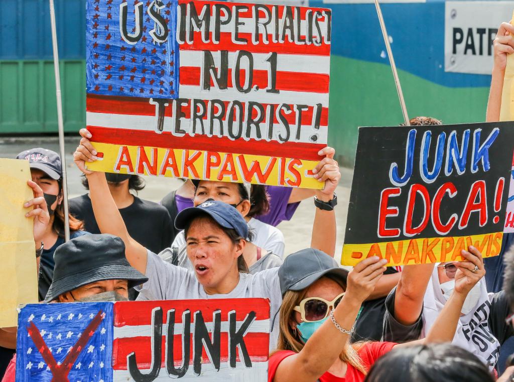 2023年4月11日,在菲律賓首都大馬尼拉地區奎松城,民眾參加集會活動,抗議菲律賓和美國軍方舉行聯合軍事演習。菲律賓和美國軍方當天在菲首都馬尼拉啟動為期18天的2023年度“肩并肩”聯合軍事演習。新華社發(烏馬利攝)