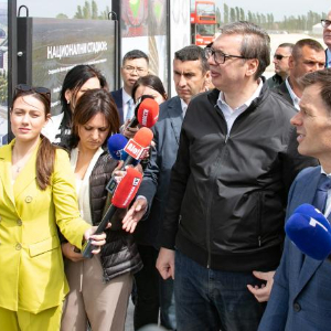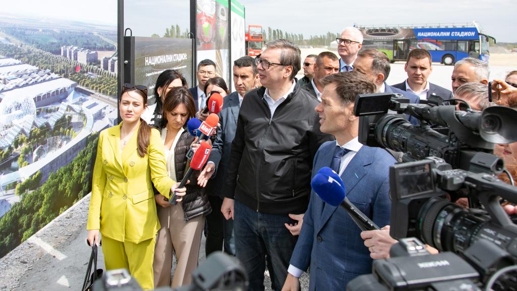2024年5月1日在塞尔维亚贝尔格莱德举行的塞尔维亚国家足球体育场项目奠基仪式上,塞尔维亚总统武契奇(中)观看展板。新华社发(王韡摄)