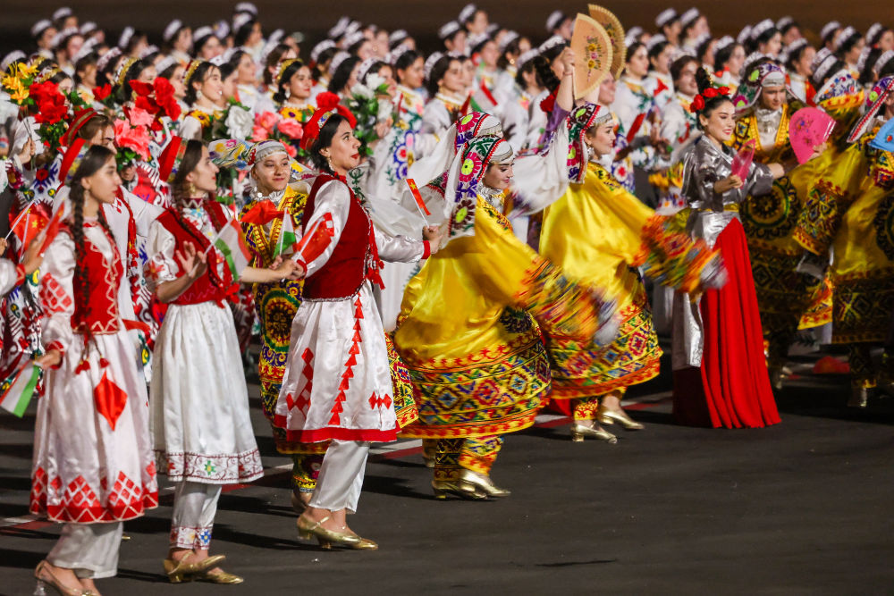 1500多名身着民族盛装的塔吉克斯坦青年表演富有浓郁特色的中塔歌舞,挥舞中塔两国国旗,表达对中国最尊贵客人的热烈欢迎。