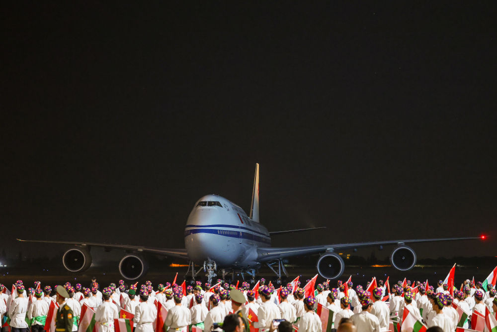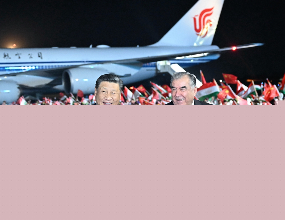 专机抵达杜尚别国际机场时,拉赫蒙率高级官员热情迎接。塔吉克斯坦儿童向习近平献花,用中、塔文欢迎习近平主席到访。两国元首在机场共同欣赏青年们表演的中塔歌舞。