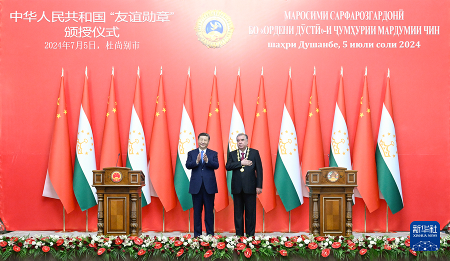 新华社杜尚别7月5日电(记者郑开君 史霄萌)当地时间7月5日下午,国家主席习近平在杜尚别总统府举行隆重授勋仪式,向塔吉克斯坦总统拉赫蒙颁授“友谊勋章”。