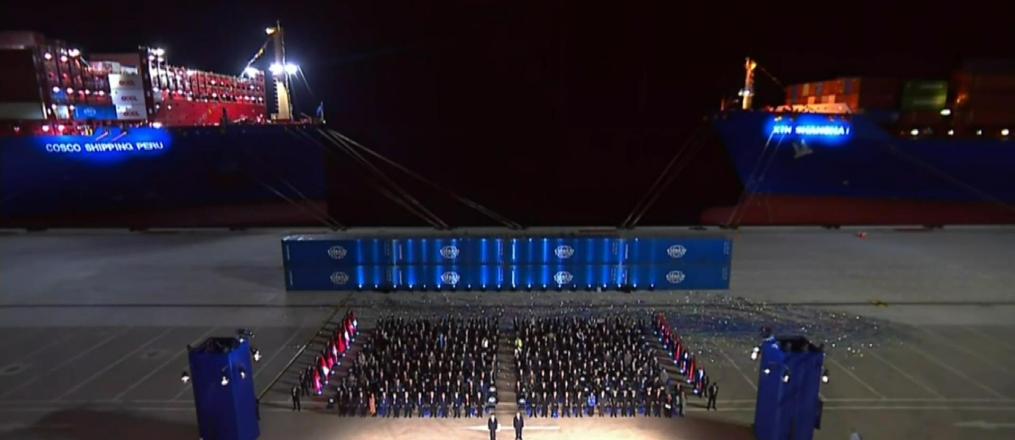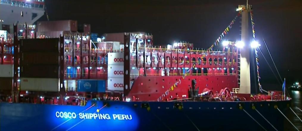 开港仪式现场停泊着两艘集装箱轮。其中一艘中远“秘鲁轮”刚刚抵港,而另一艘“新上海轮”即将离港前往上海。“从钱凯到上海”,已成为现实。