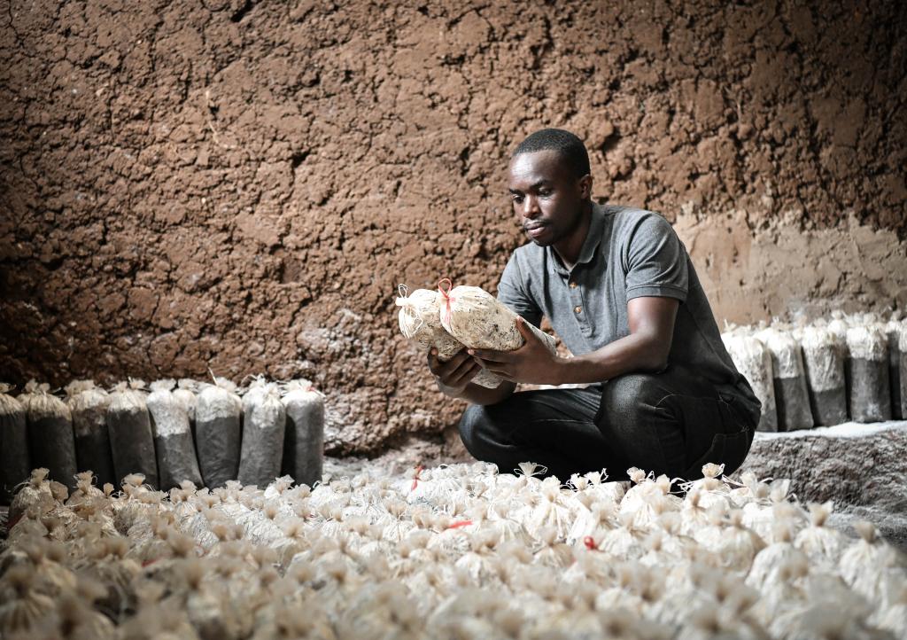 2024年8月14日,在卢旺达南方省穆汉加区,尼扬博·奥贝德在食用菌培育工坊内检查菌袋。曾两次赴中国进行菌草技术培训的尼扬博·奥贝德在南方省和东方省各拥有一家工坊。(新华社记者韩旭摄)