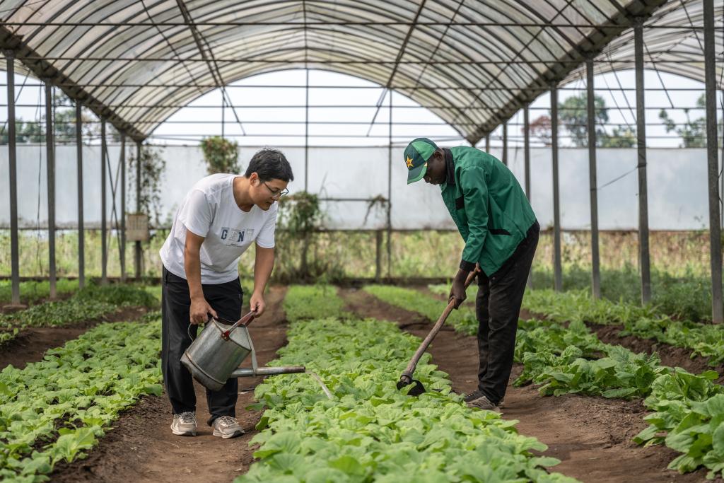 2024年8月3日,在刚果(布)首都布拉柴维尔的中国援刚果(布)农业技术示范中心内,中方农业专家李科明(左)与当地员工在大棚内耕作。(新华社记者郑扬子摄)